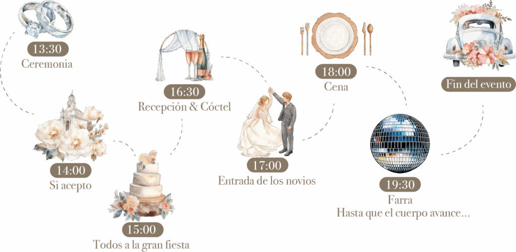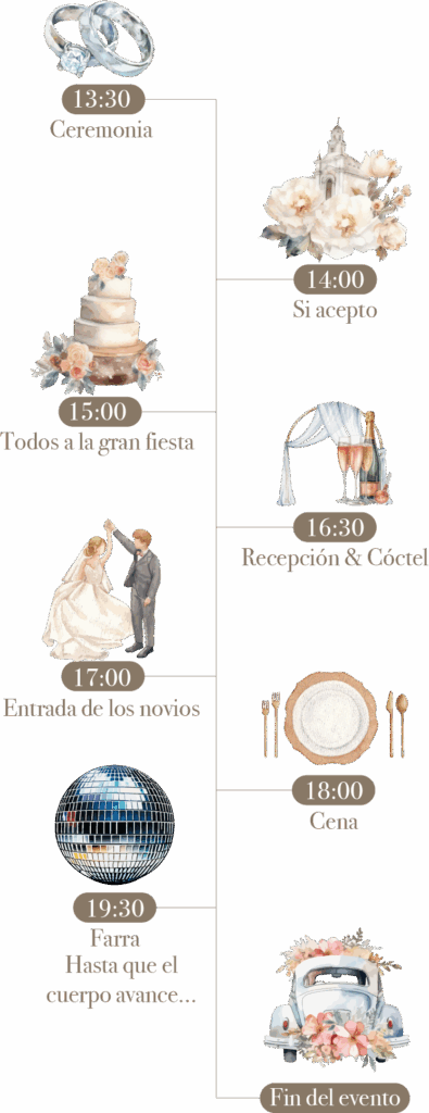 Recuerda organizarte con tiempo para que no te pierdas ningún momento de este día tan especial para nosotros.